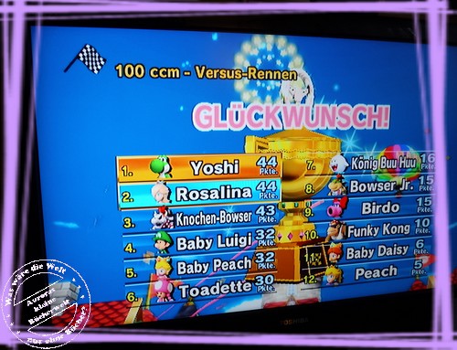Einmal schafften wir es sogar beide quasi auf Platz 1 mit der gleichen Punktzahl. Weil das aber treppchenmäßig nicht so wirklich geht und weil ich ja Geburtstag hatte, war tabellenmäßig mein geliebter Yoshi ganz oben. :D